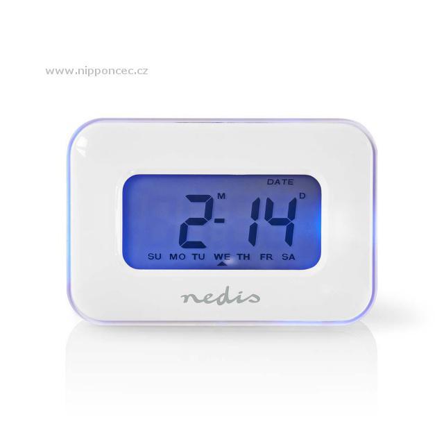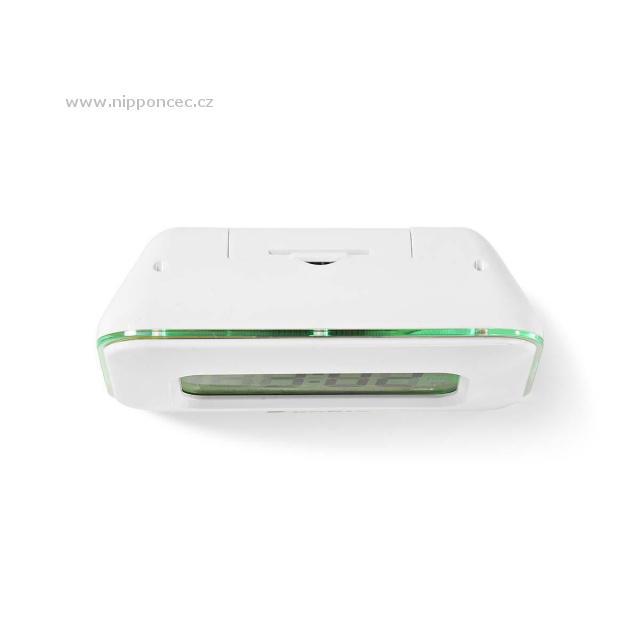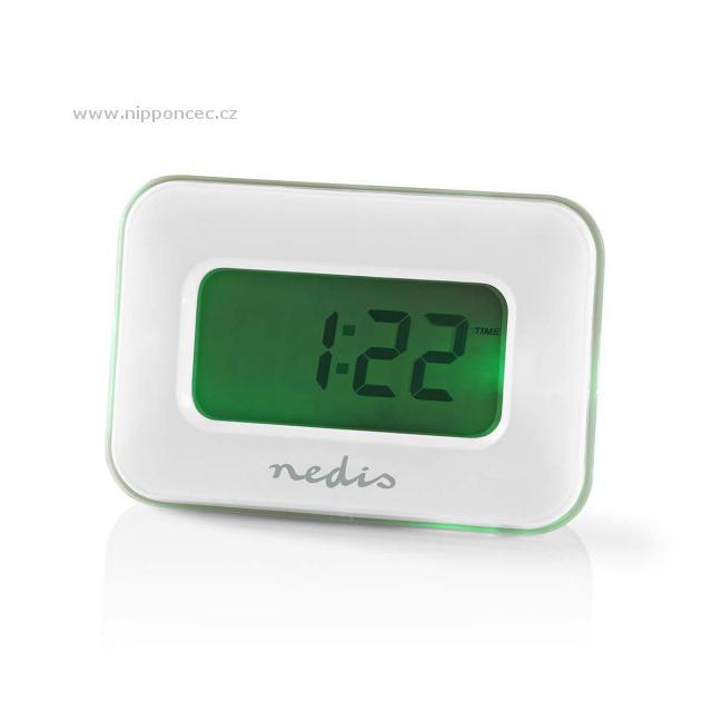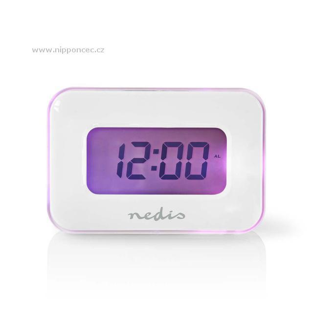 Digitální budík, kompaktní velikost, barevně podsvícený displej.