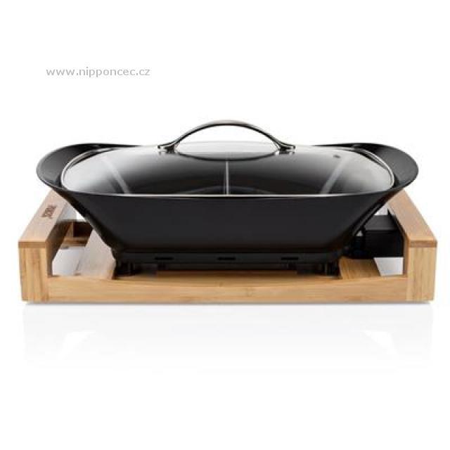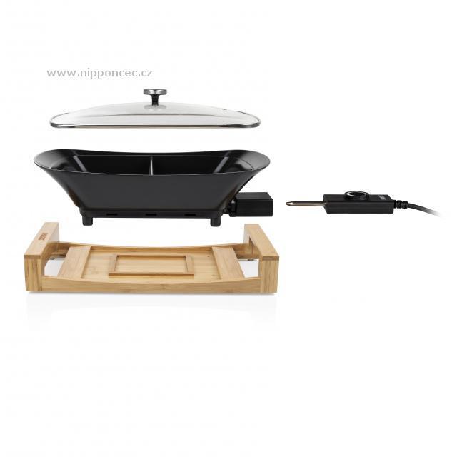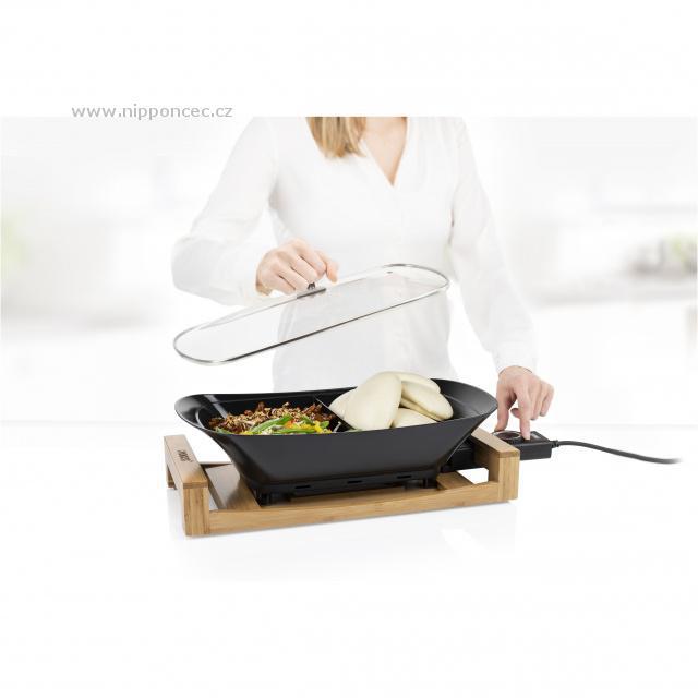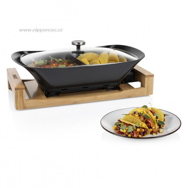 Tato nádherná pánev s dvěma přihrádkami vám bude parádně doplňovat kuchyňskou linku. Pánev je vybavena nastavitelným termostatem a designovým bambusovým táckem, pomocí kterého můžete ještě vařící pánev přenášet. Kabel s termostatem je oddělitelný, takže po uvaření pokrmů stačí kabel oddělit a pánev s právě upraveným pokrmem přenést na stůl.