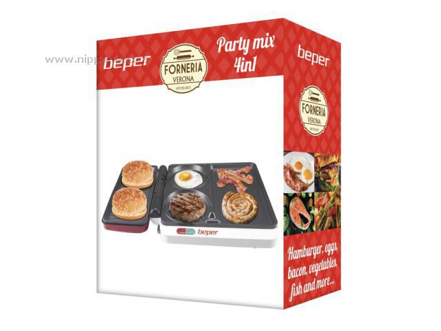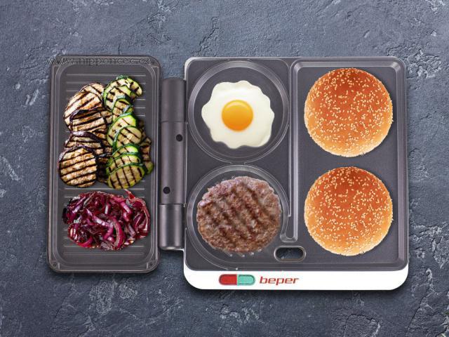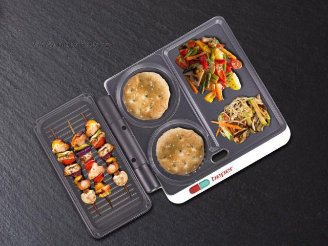 Multifunkční gril Beper pro přípravu hamburgeru, grilovaného masa, klobásek, ryb, grilované zeleniny, omelet a tortill. Skvělý pro rychlé jídlo, letní party nebo rodinnou akci. 4 typy varných desek z nepřilnavého materiálů se snadno čistí. Gril je vybaven otvorem pro odtok tuku a odnímatelným zásobníkem přebytečného tuku.