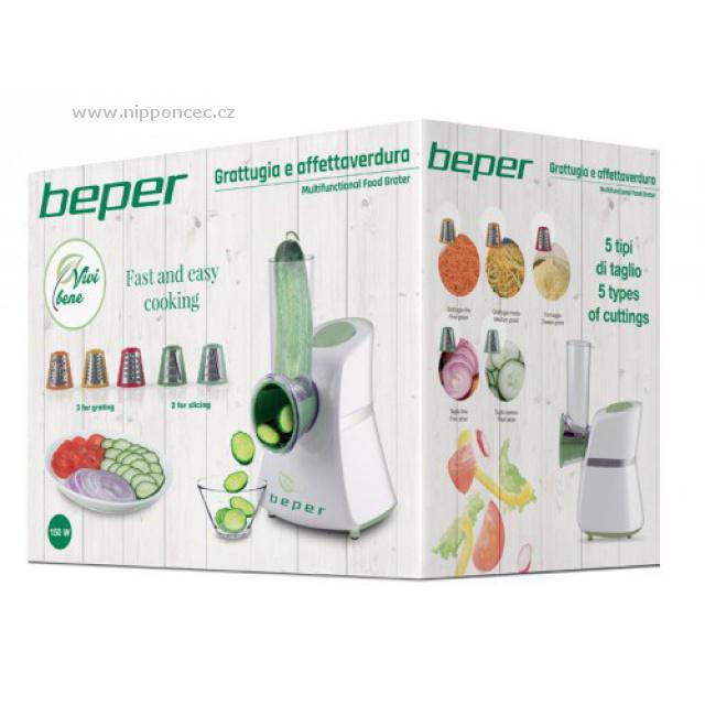 Multifunkční elektrický kráječ a strouhač BEPER BP450 pro zjednodušení strouhání a krájení mnoha druhů zeleniny, brambor, ovoce, sýra nebo čokolády. Součástí balení je pět výměnných kotoučů. Umožní krájet tenké či vlnité plátky nebo strouhat suroviny ve třech různých stupních hrubosti. Praktický pomocník v každé domácnosti.