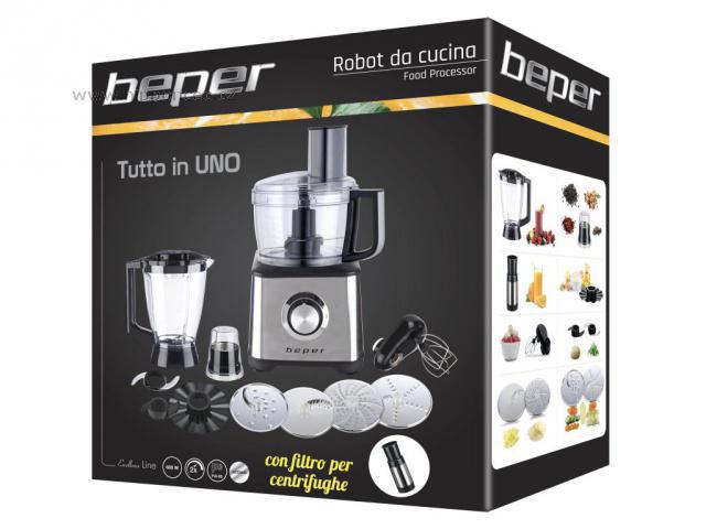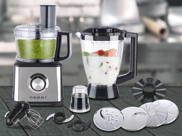 Potřebujete nakrájet zeleninu, připravit lahodný koktejl nebo umlít kávu, to vše, a ještě mnohem víc umí multifunkční robot BEPER BP500. Díky jeho možnostem se stane tím nejlepším pomocníkem ve vaší kuchyni. Kuchyňský robot má dvě vyměnitelné nádoby o objemu 1,2 a 1,75 litru, ke každé nádobě náleží víko s otvorem pro přidávání přísad, s nímž zůstanou suroviny při mixování a krájení pěkně v nádobách. Součástí jsou i víceúčelové řezací a sekací disky, emulzní disk, šlehací metly a mlýnek na kávu, ve kterém umelete i ořechy nebo koření. Robot je opatřen protiskluzovými nožkami, 2 rychlostmi a pulsní rychlostí. Váží 4,53 kg a jeho výkon je 600 W. Určitě se stane vaším nepostradatelným kuchyňským doplňkem.