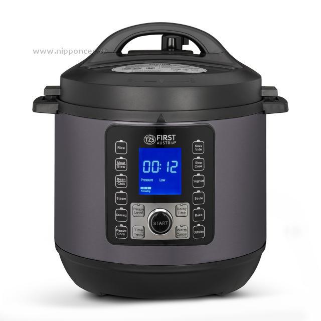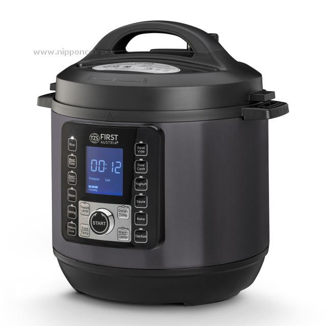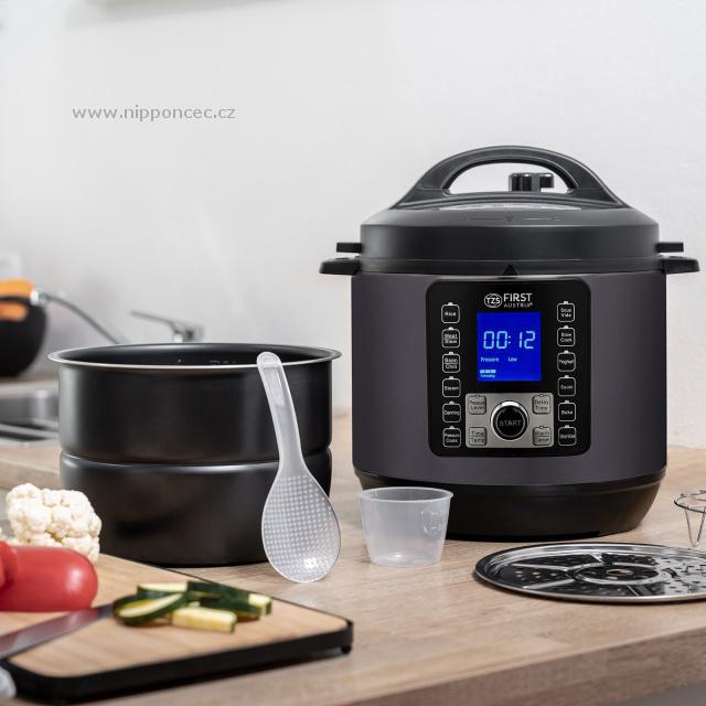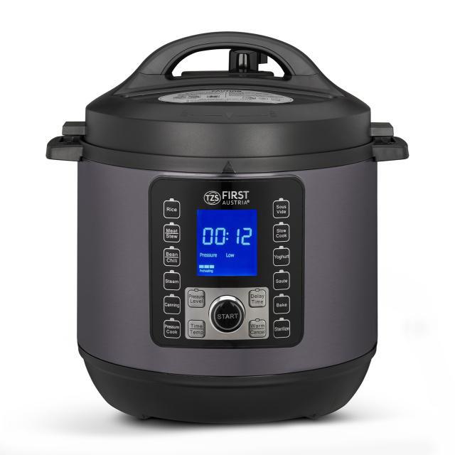 S tímto elektrickým hrncem zvládnete rychlé, energeticky úsporné a zdravé vaření zeleniny, masa, ryb, brambor a dalších potravin na mnoho způsobů bez ztráty vitamínů a minerálů. Elektrický tlakový hrnec First Austria FA 5130-2 2v1 v novém provedení z oceli v antracitově šedé barvě přichází s komfortní výbavou : 12 automatických programů Rýže, Maso / Dušení, Fazole / Chilli, Vaření v páře, Konzervování, Tlakové vaření, Sous-Vide, Pomalé vaření, Příprava Jogurtu, Sauté (restování), Pečení, Sterilizování, integrovaná funkce časovače, extra funkce udržení tepla, a digitální programování, obsah 6L. Je vhodný pro rychlé, energeticky úsporné a zdravé vaření zeleniny, masa, ryb, brambor a dalších potravin - do měkka, bez ztráty vitamínů a minerálů díky krátkému času přípravy. Úspora oproti klasickému vaření je cca 60-70% elektrické energie. Součástí dodávky je kuchařka - 8 základních receptů.