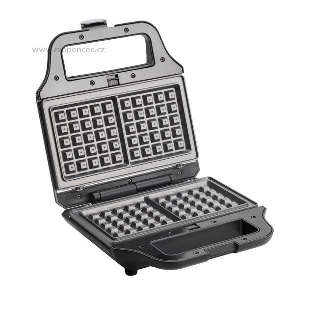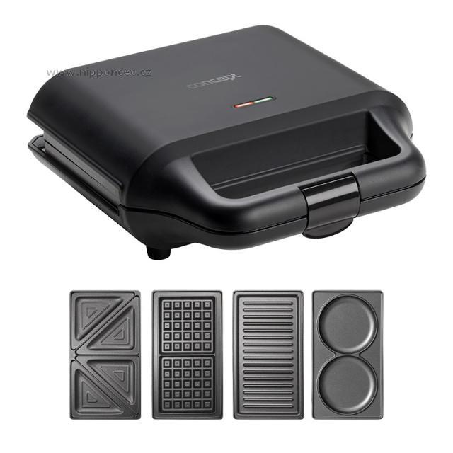 S multifunkčním toustovačem 4v1 Concept SV3055 připravíte teplé a chutné jídlo během několika minut. Tento šikovný pomocník zastane práci hned 4 spotřebičů - sendvičovače, vaflovače, lívanečníku a grilu. V kuchyni vám nebude překážet a díky vyměnitelným pečicím deskám s nepřilnavým povrchem, které můžete dát do myčky na nádobí, zabere jeho údržba minimum času. Toustovač má světelnou kontrolku nahřátí a automatickou regulaci teploty. Pro snadnou a bezpečnou manipulaci je vybaven tepelně izolovaným držadlem, zámkem pečicích desek a protiskluzovými nožičkami.