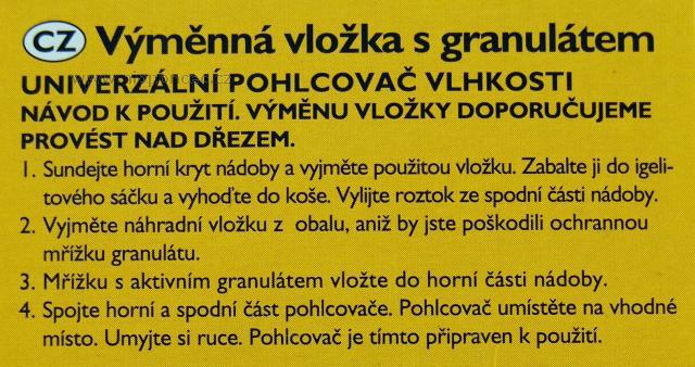 Pohlcovač vlhkosti je ideální pro místa kde vzniká vlhkost jako jsou kuchyně, koupelny, místa v blízkostí plastových oken apod. Kontroluje vlhkost vzduchu a zabraňuje vzniku plísní a koroze. Absorbční granulát na sebe váže vlhkost z okolí a přeměňuje ji na roztok, který odtéká do zásobníku.
