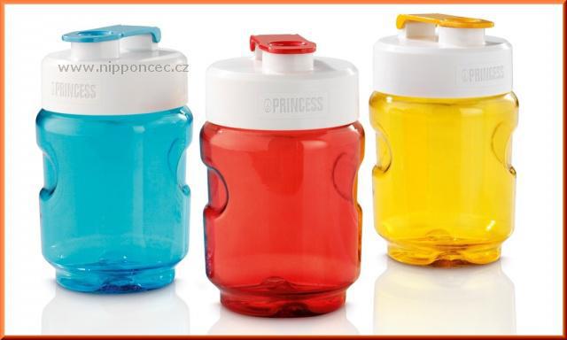 Náhradní uzavíratelné nádobky pro mixér Princess 21 7400 - set tří kusů - oranžová, červená a modrá.