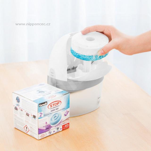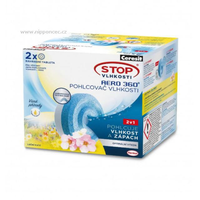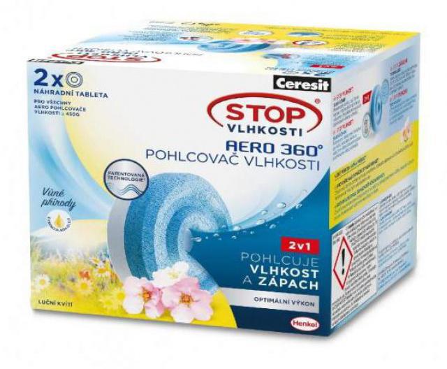 Nová generace absorpčních tablet do pohlčovače vlhkosti Ceresit Stop Vlhkosti AERO 360°. Nové tablety byly vyvinuté tak, aby jejich účinek pohlcování nadměrné vlhkosti byl vyšší až o 40% (po vložení do nového přístroje Ceresit Stop Vlhkosti AERO 360°). Díky členitému tvaru a proudění vzduchu okolo tablety jsou první absorpované kapky viditelné už po 12 hodinách. Tablety v přístroji se spotřebovávají postupně, zmenšují svůj objem. Vysrážená tekutina se soustřeďuje ve spodní části přístroje. Po spotřebování je potřebné vložit novou tabletu. Důležité je vkládat tabletu do nového přístroje AERO 360° po jeho otevření modrou stranou dolů. Modrá část účinně redukuje pachy, bílá část pohlcuje nadměrnou vzdušnou vlhkost.