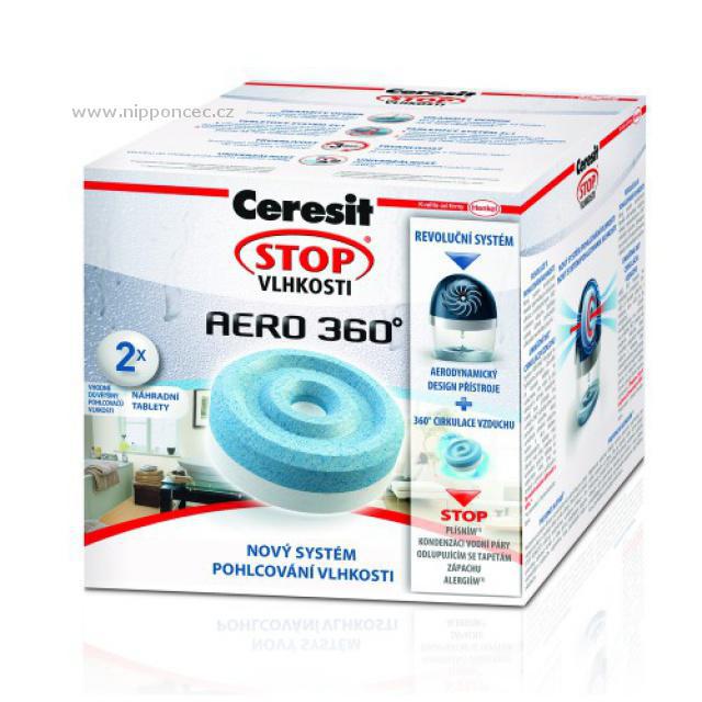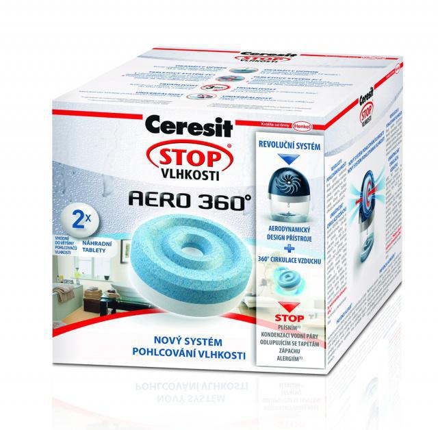 Nová generace absorpčních tablet do pohlcovače vlhkosti Ceresit Stop Vlhkosti AERO 360° v balení 2 x 450 g. Nové tablety byly vyvinuté tak, aby jejich účinek pohlcování nadměrné vlhkosti byl vyšší až o 40% (po vložení do nového přístroje Ceresit Stop Vlhkosti AERO 360°). Díky členitému tvaru a proudění vzduchu okolo tablety jsou první absorpované kapky viditelné už po 12 hodinách. Tablety v přístroji se spotřebovávají postupně, zmenšují svůj objem. Vysrážená tekutina se soustřeďuje ve spodní části přístroje. Po spotřebování je potřebné vložit novou tabletu. Důležité je vkládat tabletu do nového přístroje AERO 360° po jeho otevření modrou stranou dolů. Modrá část účinně redukuje pachy, bílá část pohlcuje nadměrnou vzdušnou vlhkost.