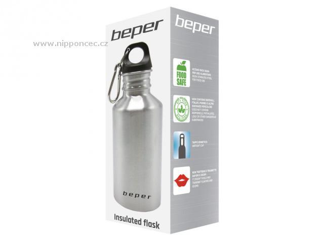 Lehká a kompaktní nerezová lahev BEPER má vzduchotěsný uzávěr s karabinou a zajistí tak bezpečnou přepravu nápoje. Lahev vám umožní dopřát si nápoj nejen doma, ale i na výletě, při sportu nebo při cestě do zaměstnání. Díky svému tvaru se snadno vejde do každého zavazadla. Pojme až 500 ml tekutiny.