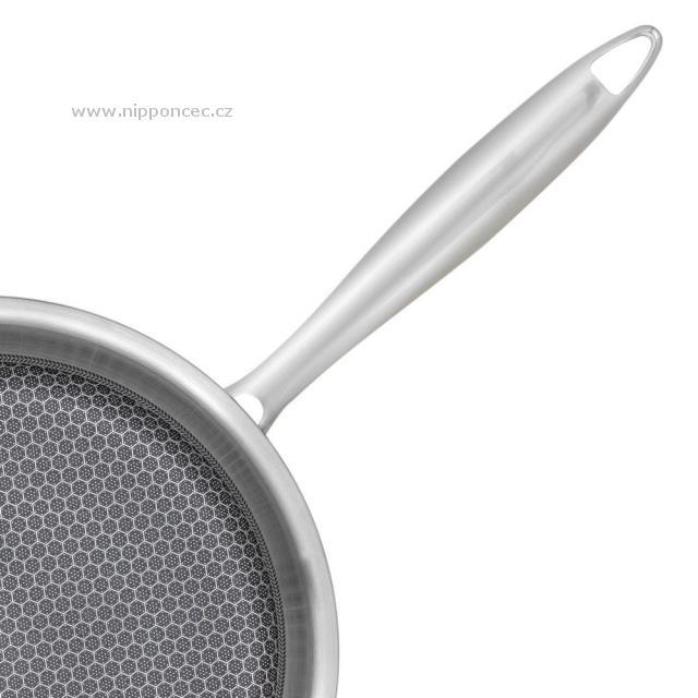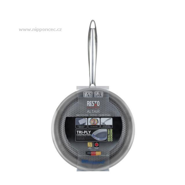 Nerezová pánev Resto 95012 s nepřilnavým povrchem je vhodná pro všechny typy sporáků, včetně indukčních. Pánev je ideální pro smažení a restování pokrmů i k přípravě omáček. Zároveň ji lze použít i v troubě až do 220 °C. Hliníkové jádro se táhne napříč dnem a po stranách pánve a rychle i rovnoměrně ji zahřívá. Textura "včelí plástve" chrání vnitřní nepřilnavý povrch, a proto nedojde tak snadno k jeho poškození při použití šlehací metly, lžíce nebo kovové špachtle. Kolekce pánví ALTAIR je určena pro domácí i profesionální kuchaře.