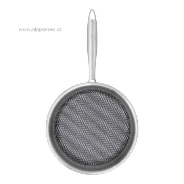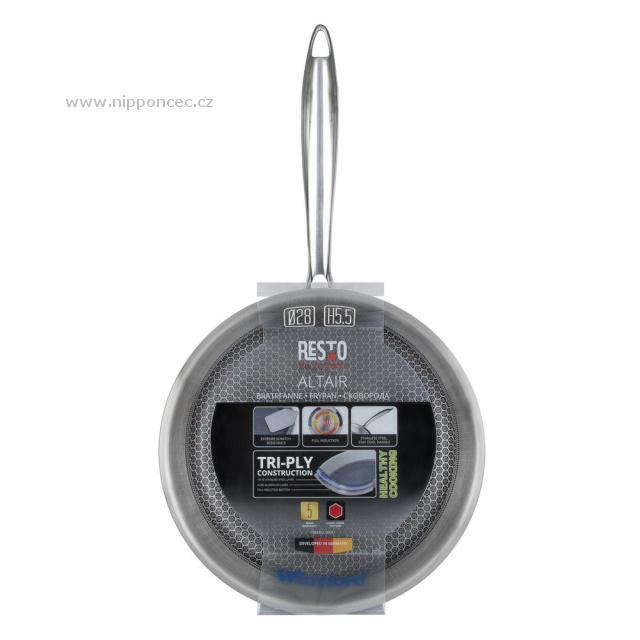 Nerezová pánev Resto 95013 s nepřilnavým povrchem je vhodná pro všechny typy sporáků, včetně indukčních. Pánev je ideální pro smažení a restování pokrmů i k přípravě omáček. Zároveň ji lze použít i v troubě až do 220 °C. Hliníkové jádro se táhne napříč dnem a po stranách pánve a rychle i rovnoměrně ji zahřívá. Textura "včelí plástve" chrání vnitřní nepřilnavý povrch, a proto nedojde tak snadno k jeho poškození při použití šlehací metly, lžíce nebo kovové špachtle. Kolekce pánví ALTAIR je určena pro domácí i profesionální kuchaře.