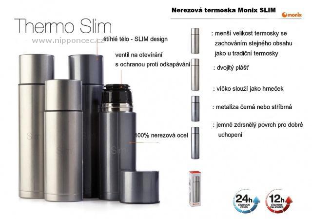 Kvalitní termoska Monix z nerezové oceli, odolná proti nárazům, dvojitým pláštěm, tlačítkovým uzávěrem. Víčko slouží jako hrneček, nekoroduje, netvoří se na ní skvrny, snadná manipulace. Termoska je v provedení stříbrná metalíza s velmi jemně zdrsnělým povrchem, aby neklouzala z ruky. SLIM DESIGN: do menší velikosti termosky se vejde stejné množství nápoje, jako do termosky standardní velikosti, nezabere tolik místa. Modrá orientační tabulka znázorňuje účinnost termosky pro studený nápoj - při venkovní teplotě 22 stupňů Celsia a teplotě nápoje 1 stupeň Celsia, červená pro horký nápoj - při venkovní teplotě 22 stupňů Celsia a teplotě nápoje 90 stupňů Celsia.