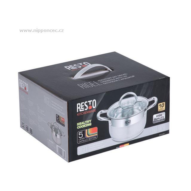 Hrnec z nerezové oceli Resto 92104 z kolekce Rigel se skleněnou poklicí s výstupem páry. Hrnec má ultra hladký povrch, který je odolný vůči skvrnám, korozi a snadno se čistí. Je vhodný pro všechny typy sporáků včetně indukčních.