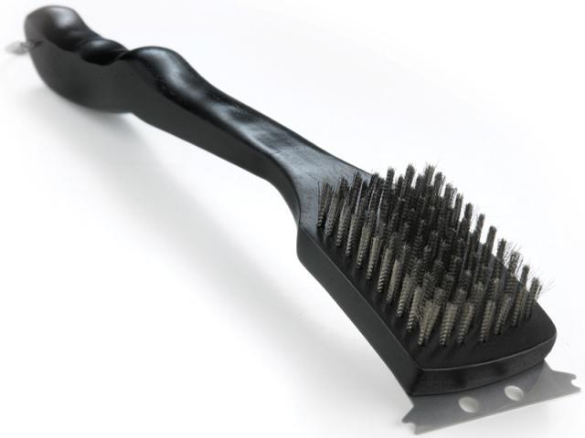 Kartáč na gril s dřevěnou rukojetí a štětinami z nerezové oceli pro důkladné čištění roštů grilu. Kartáč je vybaven ocelovým hrotem, určeným k seškrabání připečených zbytků z roštu.