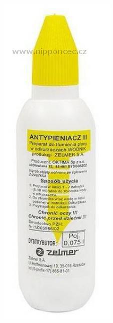 Neutralizátor pěny pro vysavače se sáním přes vodu Tento praktický odpěňovač využijete nejen pro vysavače Zelmer Vodník, Wodnik, Aquawelt, Aquos, Aquario, Delfin, Multi, Trio, Quatro - ale i pro další vysavače jiných výrobců uzpůsobených pro mokro-suché sání. Neutralizátor pěny - neboli odpěnovač Zelmer je určen pro vodní vysavače s mokrosuchým sáním - různých modelových řad, praktické příslušenství k vysavačům s mokrým vysáváním. Obsah plastové lahve se šroubovacím uzávěrem je 75 ml. Odpěňovač k šamponování je vhodný např. pro vysavače: BOSCH AquaWash&Clean BOSCH BWD41720 BOSCH BWD41740 BOSCH BWD420HYG BOSCH BWD421PET BOSCH BWD421PRO ZELMER 519 ZELMER 619 ZELMER 620 ZELMER 819 ZELMER 829 ZELMER 829.5 ZELMER 919 ZELMER 919.5 ZELMER VC 7920 ZELMER ZVC 722 ZELMER ZVC 752 ZELMER ZVC 762 ZELMER Vodník ZELMER Wodnik ZELMER Multi ZELMER Aquos ZELMER Aquario ZELMER Aquawelt ZELMER Delfin ZELMER Quattro....