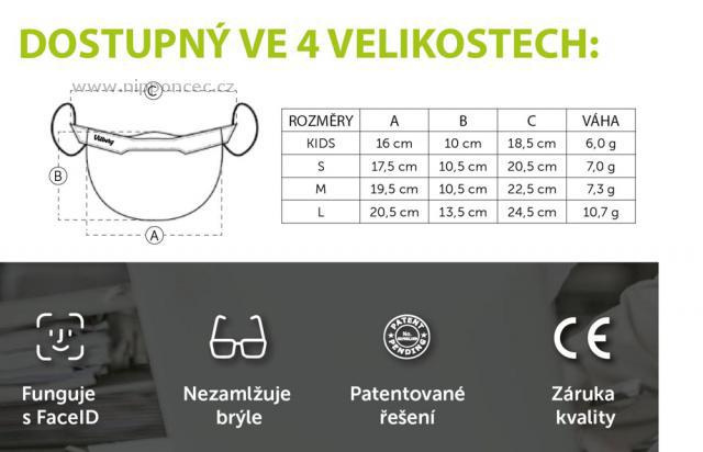 Nošení štítu je komfortní - je lemován měkkým filcem proti otlaku, s všitým nosním tvarovacím páskem pro přesné nastavení přítlaku proti zamlžování brýlí, a vysoce elastickým i gumičkami za uši. Je velmi lehký - 10g a také perfektně sedí na obličeji, za chvíli ani nevíte, že jej máte.