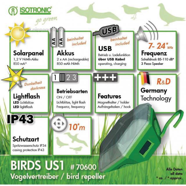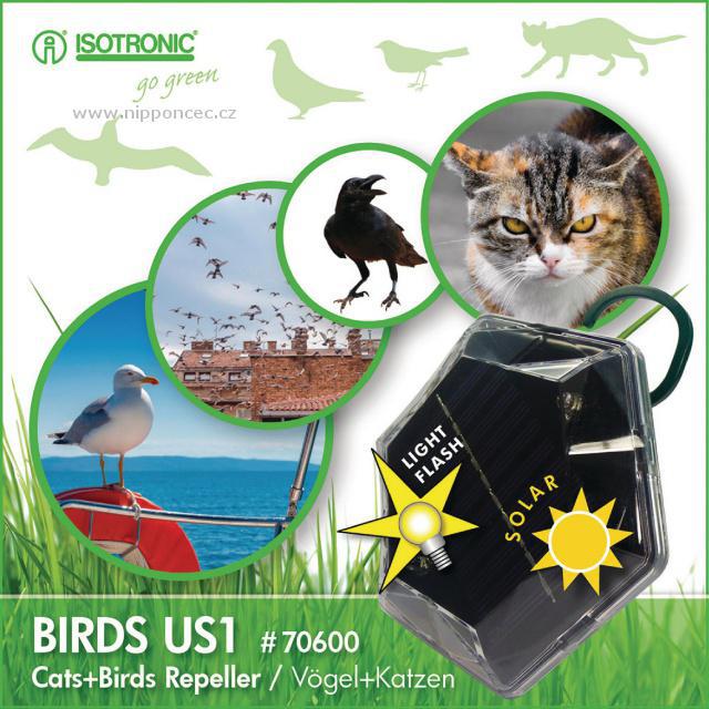 Inovativní přenosný venkovní plašič koček, ptáků, racků, holubů aj. Nabíjecí - buď USB nebo solární, vysoce efektivní. Přístroj vydává kočkám a ptákům vysoce nepříjemné zvuky, navíc doprovázené světelným signálem. To je obvykle dostatečný argument, který přinutí nezvané návštěvníky vaší zahrady, pískoviště, rybníku apod. vyklidit pole. Díky vysílanému signálu, který se periodicky mění, si škodná na zvuk ani světelné záblesky nezvykne.