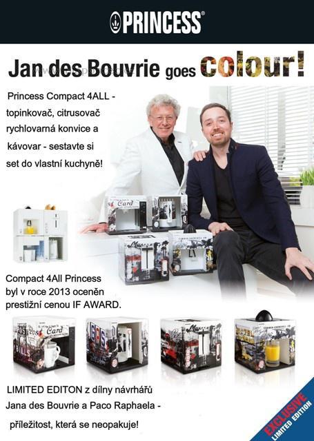 Citrusovač Princess ze sady Compact4All (4 v jednom) z dílny známého holandského návrháře Jana des Bouvrie, v designové kolekci "Limited Edition by Paco Raphael". Tento set, kdy můžete výrobky používat jednotlivě, nebo z nich čtveřici praktickou kostku či řadu - s jedním napájením, se skládá z topinkovače, citrusovače, kávovaru a rychlovarné konvice. Výrobky z této série lze prostřednictvím citruspresu zapojit do setu s jednou přívodní šňůrou. Topinkovač, lis na citrusy, konvici i kávovar můžete samozřejmě použít i jednotlivě, jejich provedení je tak důmyslné, že nikde žádné spoje nejsou vidět, přístroj je perfektní ze všech tří stran, jak je vidět na ilustrační fotografii kompletního setu v bílé barvě.
