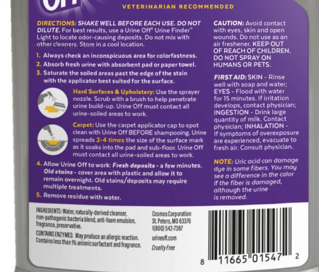 K odstranění zápachu a skvrn z psí moči vám pomůže Urine Off Dog & Puppy Formula, který využívá bioenzymatickou technologii k trvalému odstranění skvrn a pachů moči vašeho psa nebo štěněte. Kombinace mikroorganismů a jejich enzymů v nepatogenních bakteriích spolupracují na rozkladu kyseliny močové, která vytváří štiplavé aroma moči a močoviny, která ulpívá na povrchu. Urine Off je produkt na biologické bázi certifikovaný USDA. Urine Off je bezpečný přípravek, který můžete používat v blízkosti domácích zvířat a lidí.