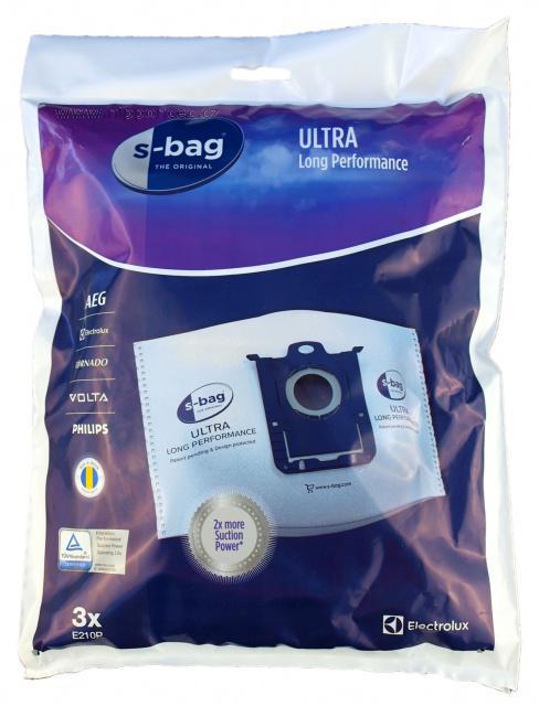 Originální sáčky Electrolux S-Bag ® Ultra Long Performance E210 3ks do vysavačů Electrolux Pure D9, UltraOne Originální sáčky Electrolux E210 UltraLong Performance S-Bag k vysavačům Electrolux a AEG UltraOne a PureD9 jsou objemově větší, než klasické sáčky S-BAG (3,5 litru), mají kapacitu 5 litrů, a jsou stranově - podélně - otočené pro lepší vložení do vašeho špičkového vysavače. V balení Electrolux E210P 3ks sáčků..