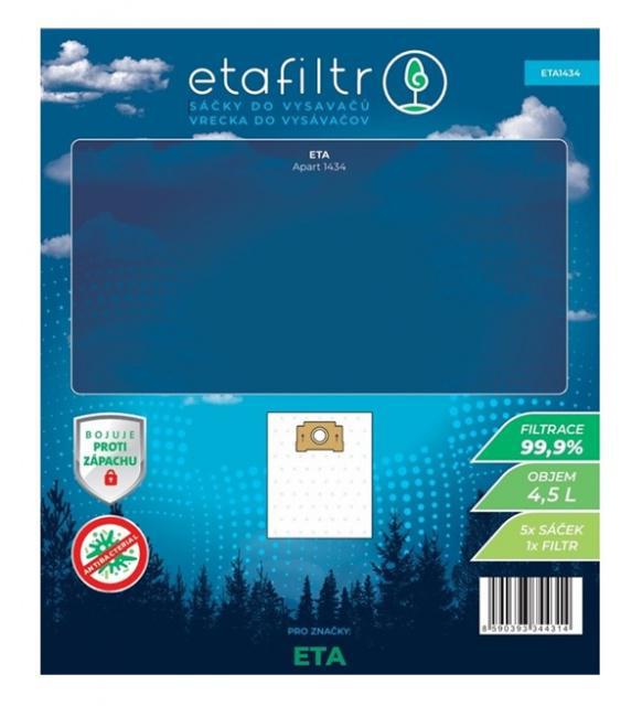Originální sáčky do vysavače vysavače Eta Apart 1434. 5ks sáčků v balení, 1x filtr k zastřižení. Sáčky z netkané textilie (SMS, mikrovlákna) s vysokým stupněm filtrace.