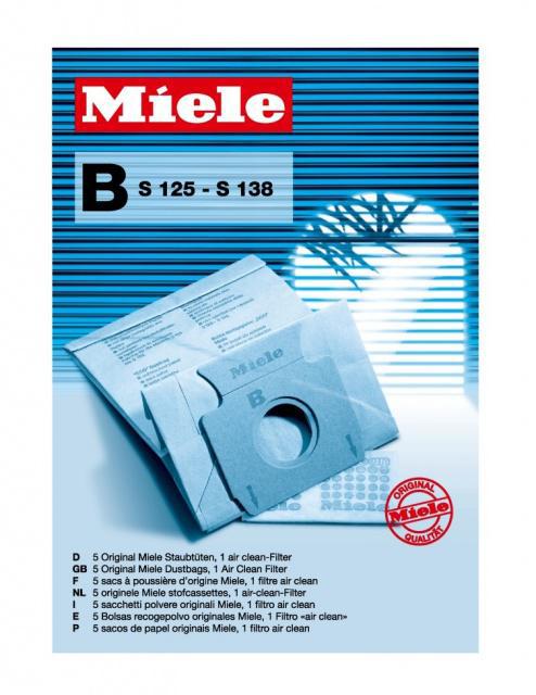 Originální sáčky MIELE B pro vysavače Miele S125 až S138 5ks Sáčky do vysavačů MIELE S 125 - S 138, typ B - 5ks. Balení obsahuje 5 ks originální sáčků do vysavače MIELE, 1 ks filtru AirClean a 1 ks motorového filtru.