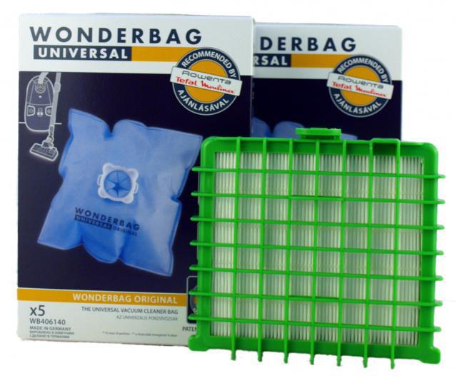 Dodávka 10 ks originálních sáčků do vysavačů Rowenta a náhradní filtru HEPA. Sáčky jsou vyrobeny z vícevrstvé netkané textilie z mikrovláken, objem sáčku je 5 litrů. Sáčky Wonderbag Endura Rowenta vynikají vysokou filtrací - odfiltrují 99% mikronečistot - jako pyly, roztoči a další alergeny. Sada je určena pro vysavače ROWENTA:Artec 2, RO4100 až RO4199 Artec 2, RO4200 až RO4299, RO4300 až RO4399 X-Treme , Rowenta Silence Force, Rowenta Silence Force Compact, RO4400 až RO4499, Silence Force RO4500 až RO4699, Rowenta Silence Force RO4700 až RO4799, Rowenta X-Trem Power RO5421,RO5423,RO5443,RO5461,RO5473,RO5555,RO5565,RO5600 až RO5699,RO5651,RO5661, RO5700 až RO5799,RO5735OA,RO5800 až RO5900, RO5899,RO5900RO5999,RO5825,RO582501,RO5825,RO5921,RO5925,RO5927 a další typy.