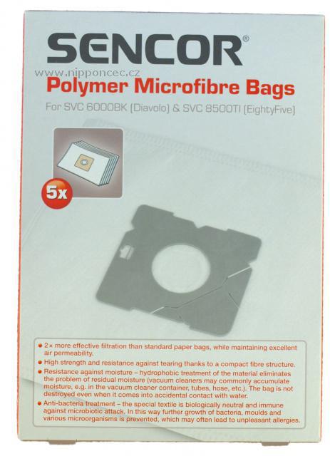 Mikrovlákenné jednorázové sáčky pro vysavač Sencor SVC 6000 BK Diavolo a SVC 8500 TI Eighty Five jsou pevné a odolné. Jejich použití zajišťuje stejnoměrný sací výkon až do zcela plného sáčku. Díky hydrofobní úpravě materiálu jsou odolné proti vlhkosti a mají antibakteriální úpravu (tkanina, ze které je sáček vyroben, brání množení bakterií a plísní a průniku mikroorganismů do do ovzduší), brání vzniku alergií.