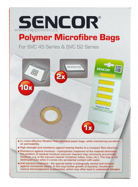 Mikrovlákenné jednorázové sáčky pro vysavač Sencor SVC 45RD, SVC 45WH, SVC 45BK, SVC 45BL, SVC 45GR, SVC 52BK, SVC 52GR a SVC 52WH + EU-E2 modely jsou pevné a odolné. Jejich použití zajišťuje stejnoměrný sací výkon až do zcela plného sáčku. Díky hydrofobní úpravě materiálu jsou odolné proti vlhkosti a mají antibakteriální úpravu (tkanina, ze které je sáček vyroben, brání množení bakterií a plísní a průniku mikroorganismů do do ovzduší), brání vzniku alergií.