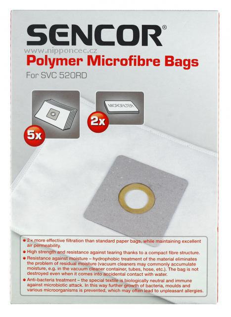 Mikrovlákenné jednorázové sáčky pro vysavač Sencor SVC520 RD jsou pevné a odolné. Jejich použití zajišťuje stejnoměrný sací výkon až do zcela plného sáčku. Díky hydrofobní úpravě materiálu jsou odolné proti vlhkosti a mají antibakteriální úpravu (tkanina, ze které je sáček vyroben, brání množení bakterií a plísní a průniku mikroorganismů do do ovzduší), brání vzniku alergií.Mikrovlákenné sáčky, sáček pro jednorázové použití