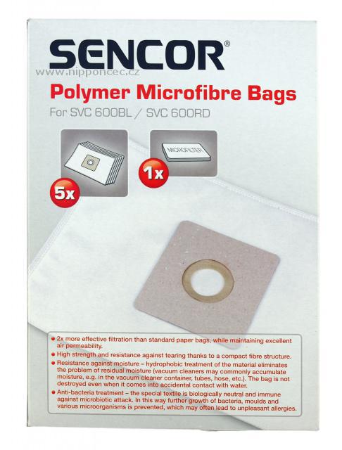 Mikrovlákenné jednorázové sáčky pro vysavač Sencor SVC600 jsou pevné a odolné. Jejich použití zajišťuje stejnoměrný sací výkon až do zcela plného sáčku. Díky hydrofobní úpravě materiálu jsou odolné proti vlhkosti a mají antibakteriální úpravu (tkanina, ze které je sáček vyroben, brání množení bakterií a plísní a průniku mikroorganismů do do ovzduší), brání vzniku alergií.