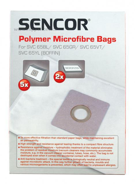 Mikrovlákenné jednorázové sáčky pro vysavač Sencor SVC65 jsou pevné a odolné. Jejich použití zajišťuje stejnoměrný sací výkon až do zcela plného sáčku. Díky hydrofobní úpravě materiálu jsou odolné proti vlhkosti a mají antibakteriální úpravu (tkanina, ze které je sáček vyroben, brání množení bakterií a plísní a průniku mikroorganismů do do ovzduší), brání vzniku alergií.
