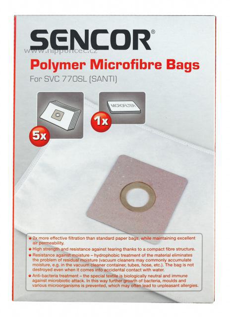 Mikrovlákenné jednorázové sáčky pro vysavač Sencor SVC770 SL  jsou pevné a odolné. Jejich použití zajišťuje stejnoměrný sací výkon až do zcela plného sáčku. Díky hydrofobní úpravě materiálu jsou odolné proti vlhkosti a mají antibakteriální úpravu (tkanina, ze které je sáček vyroben, brání množení bakterií a plísní a průniku mikroorganismů do do ovzduší), brání vzniku alergií.