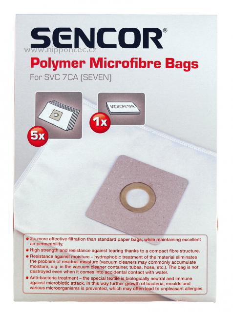 Mikrovlákenné jednorázové sáčky pro vysavač Sencor SVC7  jsou pevné a odolné. Jejich použití zajišťuje stejnoměrný sací výkon až do zcela plného sáčku. Díky hydrofobní úpravě materiálu jsou odolné proti vlhkosti a mají antibakteriální úpravu (tkanina, ze které je sáček vyroben, brání množení bakterií a plísní a průniku mikroorganismů do do ovzduší), brání vzniku alergií.