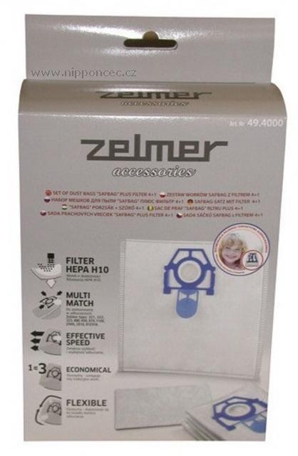 Původní označení 49.4000. Kvalitní filtrace pro vysavače Zelmer. Sáčky jsou vyrobené z 5ti vrstvého materiálu - netkané textilie - ze speciálních vláken, které dobře zadrží částice prachu, a dalších alergenů, například pylů. Mají výrazně delší životnost, než sáčky papírové. U tohoto prachového sáčku se účinnost sání při jeho postupném naplňování nijak nesnižuje, sáčky není nutné tak často měnit. Mají vysokou filtrační kapacitu - filtrují velmi účinně. Sáčky SAF - BAG Zelmer pojmou až 2x více nečistot, než klasické papírové sáčky.