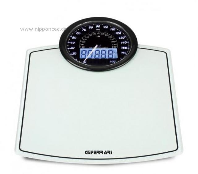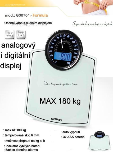 Designová osobní váha z dílny firmy G3 Ferrari Formula. Váha je vyrobena z temperovaného skla o tloušťce 6 mm, maximální váživost je 180 kg. Můžete ji přenout na kg/lg. Disponuje citlivými senzory. Velkou výhodou je duální displej - analogový i digitální - údaje jsou přehledné a snadno čitelné. Spodní část je vybavena protiskluzovými zábranami pro zvýšení stability. Provoz na 3 tužkové baterie, které jsou součástí balení.