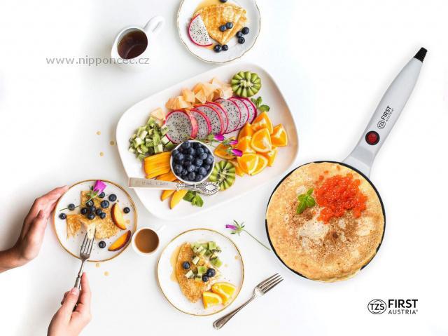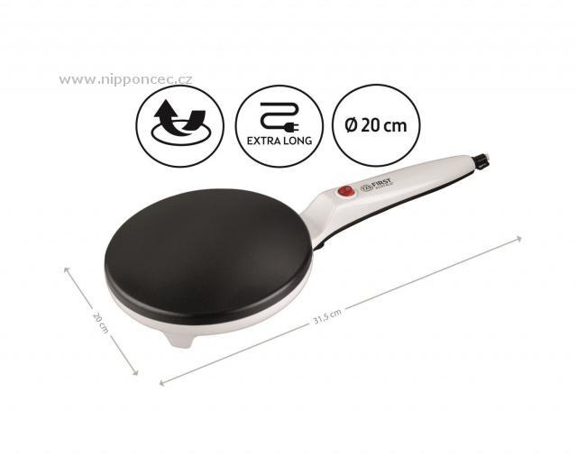 Elektrický palačinkovač First Austria FA-5307-2 pro rychlou a snadnou přípravu tenkých palačinek na snídani nebo odpolední dezert. Díky ergonomicky tvarované rukojeti můžete otáčet palačinky za letu jako opravdový šéfkuchař. Nepřilnavá povrchová úprava pečící plochy usnadňuje čistění, stačí otřít vlhkým hadříkem a palačinkovač je připraven k dalšímu použití. Součástí příslušenství malého kompaktního palačinkovače je stabilní nádoba na těsto a šlehací metla.