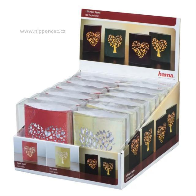 Dekorativní LED svítidlo Hama je vyrobeno z papíru vysoké kvality. Má univerzální využití - můžete ho postavit třeba do kuchyně či koupelny nebo s ním ozvláštnit party s přáteli. K dispozici jsou dva různé vyražené motivy a barvy, zajišťující zajímavé stínové efekty: srdce na červeném a strom na žluto-zeleném papíru. Svítidlo má na spodní straně vypínač ON/OFF a je napájeno dvěma AA/mignon bateriemi, které nejsou součástí balení.