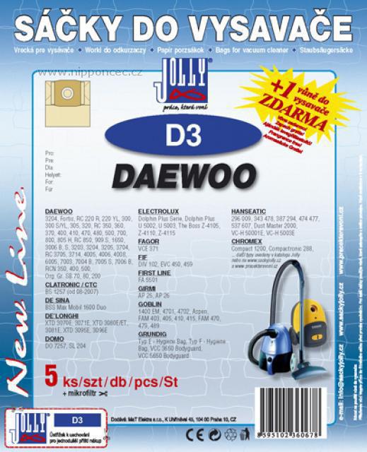 Sáčky do vysavače Jolly D3 papírové 5ks Jolly D3 toje balení 5ks náhradních sáčků pro vysavač z filtračního papíru, součástí balení je 1x vůně zdarma a 1x filtr k zastřižení. Sáčky do vysavače můžete použít jako náhradní sáčky pro skutečně velké množství vysavačů různých výrobců i modelových označení např. pro DAEWOO DWC 122DR/A, DAEWOO Fortis, DAEWOO RC 220, RC 220 R, DAEWOO RC 221, DAEWOO RC 234 TL/2A, DAEWOO RC 320, DAEWOO RC 371, RC 3714 DAEWOO RC 800, DAEWOO RC L 381 M, ECG VP 3189S, GRUNDIG VCC 3650 Bodyguard, SENCOR SVC 300, SOLAC AB 2750 Springtec, TESLA TEAM SL 204S Primo, TESLA VCT 4500 Giro.... - Sáčky Jolly D3 do vysavače Daewoo, Sencor.... a jiných
