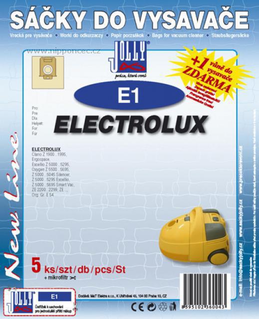 Sáčky do vysavače Jolly E1 papírové 5ks Jolly E1 to je balení 5ks náhradních sáčků pro vysavač z filtračního papíru, součástí balení je 1x vůně zdarma a 1x filtr k zastřižení. Jolly E1 Sáčky do vysavače můžete použít jako náhradní sáčky pro vysavače Electrolux Clario, Org.Gr.E54, Silencer, Excellio, Oxygen, Smart Vac....a dalších modelových označení - tyto sáčky jsou alternativou sáčků originálních pro daný typ vysavače. - Sáčky Jolly E1 k vysavačům Electrolux Clario, Org.Gr.E54, Silencer, Excellio, Oxygen, Smart Vac....