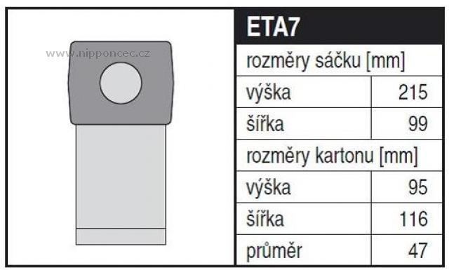 Sáčky do vysavače Jolly ETA7 papírové 10ks Jolly ETA7 to je balení 5ks náhradních sáčků kompatibilních pro Značení ETA 52, Značení ETA 54 a určených pro vysavače ETA 0409 Swing, ETA 0429 Airo, ETA 1409 Piccolo, ETA 1426, ETA 1427 Standard, ETA 1428, ETA 1429 Airo, ETA Piccollo x409, ETA Swing, GLOBALTEK GlobalPro a dalších značek a modelů vysavačů zde uvedených, z filtračního papíru, součástí balení je 1x vůně zdarma, a 1x mikrofiltr k nástřihu. - Sáčky Jolly ETA7 do vysavače Eta Airo, Swing, Picollo, Power Swing, Bomann, Philips, Tefal... a jiných