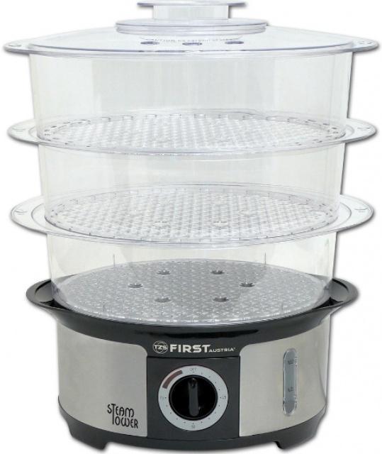 Parní hrnec First Austria má celkový objem 12l - je tedy vhodný i pro více strávníků. Vhodný pro zdravou přípravu mnoha druhů potravin - zeleniny,ryb,masa,luštěnin - bez ztráty přirozené chuti a vitaminů, využijete ho i při ohřevu. Potraviny můžete v jednotlivých patrech oddělit ještě přepážkou. Parní hrnec má digitální displej a časovač do 75 minut, lze naprogramovat i udržování teploty jídla.