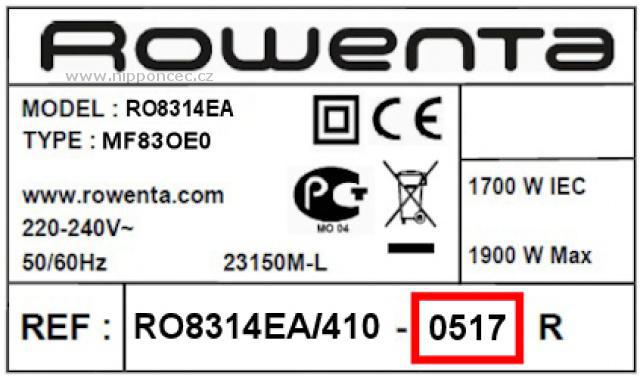 - Datum výroby vysavače je uvedeno pod výrobkem jako čtyřmístný kód. První dvě číslice odpovídají týdnu a posledním dvěma číslicím roku. Příklad viz. fotogalerie - "0517" odpovídá týdnu 05 roku 2017 (zdroj: Rowenta)