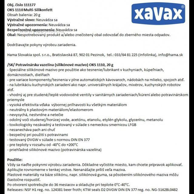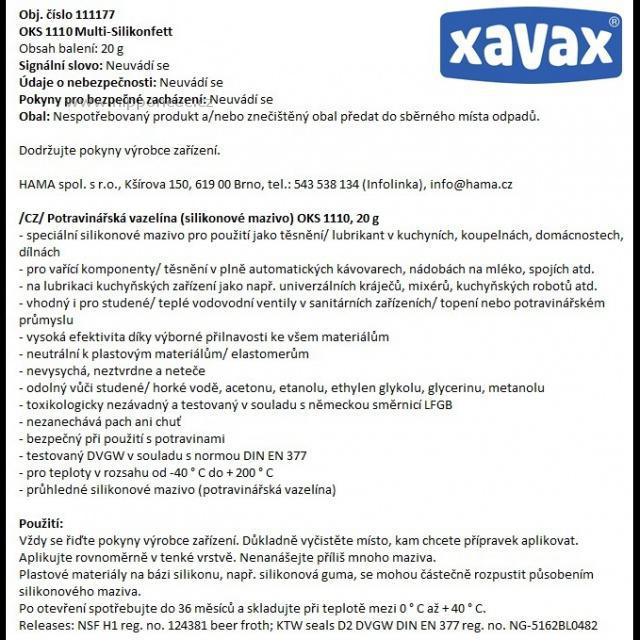 Potravinářské mazivo Xavax je bezpečné pro údržbu spotřebičů, které se používají k přípravě pokrmů a nápojů jako jsou například kávovary, univerzální kráječe, mixéry atd. Potravinářské mazivo je vhodné k použití při teplotách od -40 ° C do + 200 ° C a nezanechává pach ani chuť. Testováno DVGW v souladu s normou DIN EN 377 a německou směrnicí LFGB.