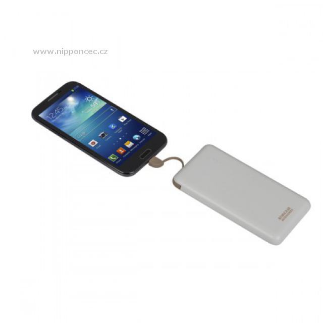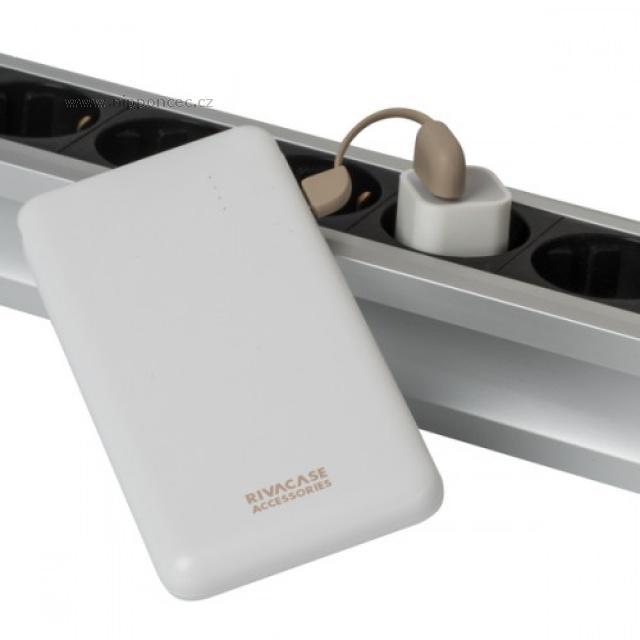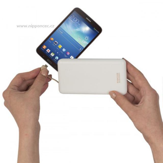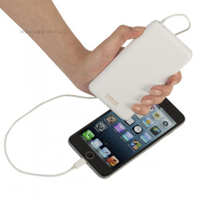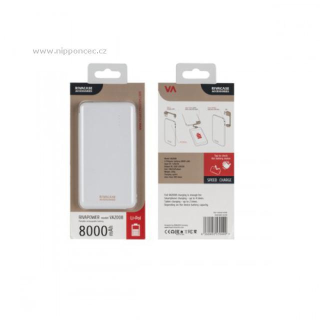 Tenká a lehká Powerbanka RIVAPOWER VA2008 s kapacitou 8000 mAh je perfektní při cestování. Disponuje vestavěným kabelem a vy se tak nemusíte obávat, že zapomenete kabel pro připojení. Pro kontrolu stavu baterie, klepněte na tělo powerbanky a 4 LED diody ukáží zbývající energii. Lze ji nabít a vybít více než 500x. Disponuje ochranou proti přebití, podbití, přetížení a zkratu. Můžete s ní nabíjet běžné modely smartphonů, tabletů a další zařízení.