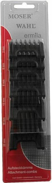 Souprava obsahuje 6 kusů plastových přídavných  hřebenů o velikosti 3, 6, 9, 12, 18, 25 mm. Přídavné plastové hřebeny jsou určeny pro střihací strojky MOSER 1854, 1871, 1881 a 1884 a WAHL 1855 a 1872.