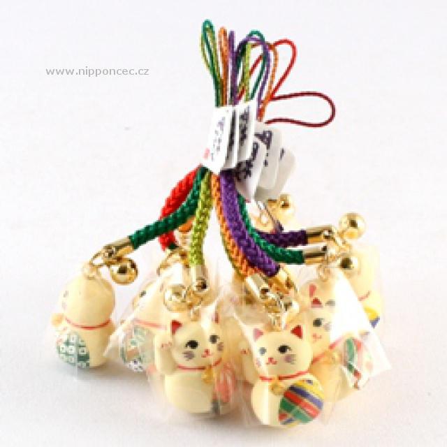 Japonská kočička pro štěstí Maneko Neko - ve smetanové barvě. Malý talisman. Se zdvihnutou pravou tlapičkou vám podle legend přivolá peníze do peněženky a štěstí do života. Na krčku má malý zvoneček ve zlaté barvě, jehož jemný zvuk připomíná zvonkohru.