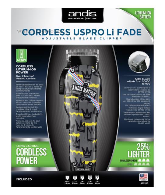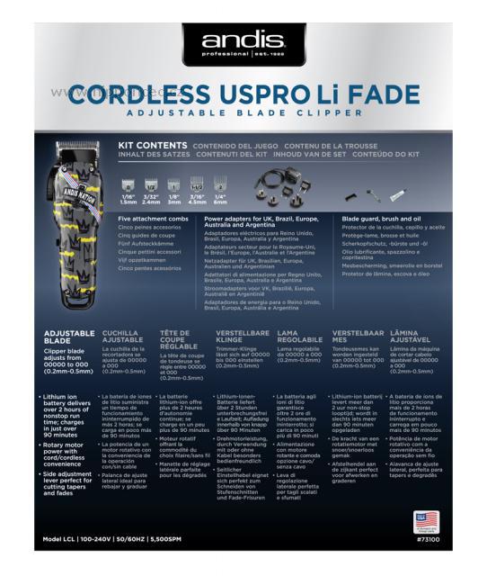 Andis Cordless UsPro Li Fade je profesionální designový zastřihovač pro stylové účesy, střihy do ztracena a jiné dokončovací práce s nastavitelnou výškou střihu od 0,2 mm - 0,5 mm. Je poháněn výkonnou lithium-iontovou baterií, která zajistí až 2 hodiny provozu a nabije se za 90 minut (možnost provozu i na kabel). Skvěle se drží v ruce nejen díky ergonomickému tvaru, ale i jeho nízké hmotnosti. Jemné ostří je vyrobeno z uhlíkové ocele.