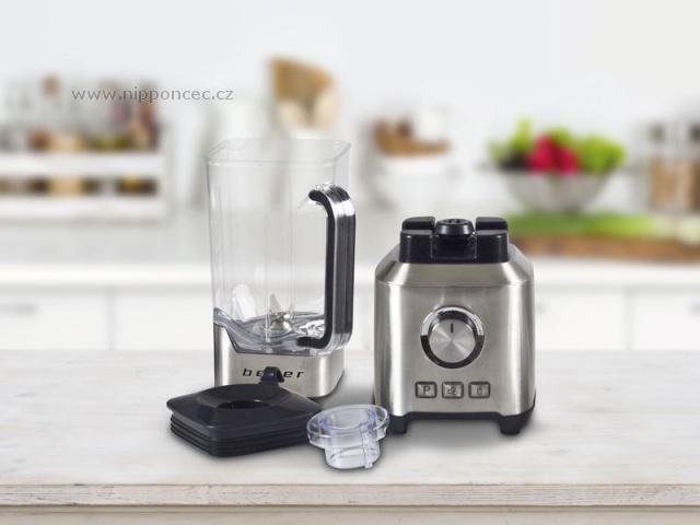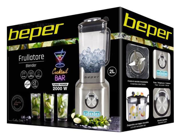 Profesionální kompaktní stolní mixér Beper BP601 vyroben z nerezové oceli má objem nádoby 2 litry a výkonný motor 2000 W. Je ideální například pro přípravu nápojů, smoothie a pomazánek. Praktickým otvorem ve víku se do nádoby lehce vkládají ingredience i při těch nejvyšších otáčkách, samozřejmostí je možnost otáčky si i regulovat. Pro snadnou manipulaci s nádobou je nádoba opatřena rukojetí, dno pokrývá 6 vysoce kvalitních nožů z nerezové oceli. Mixér je vybaven třemi funkcemi - funkcí PULS, která vám krátkodobě spustí mixér na maximální rychlostní stupeň, funkcí ICE CRUSHER, která vám rozdrtí led a funkcí BLENDER na promíchávání ingrediencí. Stabilitu na kuchyňské desce zajistí protiskluzové nožičky a o bezpečnost se postará bezpečnostní pojistka. S těmito všemi vymoženostmi se mixér stane nepostradatelným pomocníkem ve vaší kuchyni.