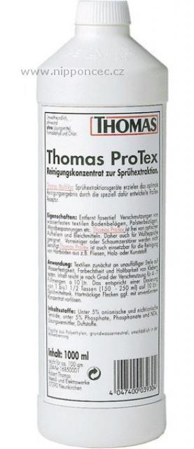 Koncentrát ProTex značky Thomas je vhodný pro strojní čištění textilií a koberců. Jedná se o koncentrovaný nepěnivý prostředek a můžete jej využít na čištění nejrůznějších textilií, koberců, čalounění autosedaček a podobné. Láhev koncentrátu obsahuje 1 litr čisticího prostředu ze kterého připravíte 50 litrů čisticího prostředku. Ten vystačí na vyčistění plochy o rozloze cca 100 m2. Koncentrát se dávkuje 20 ml na 1 litr vlažné vody. Před aplikací na tkaninu je doporučené prověření stálosti barev na malém kousku materiálu.