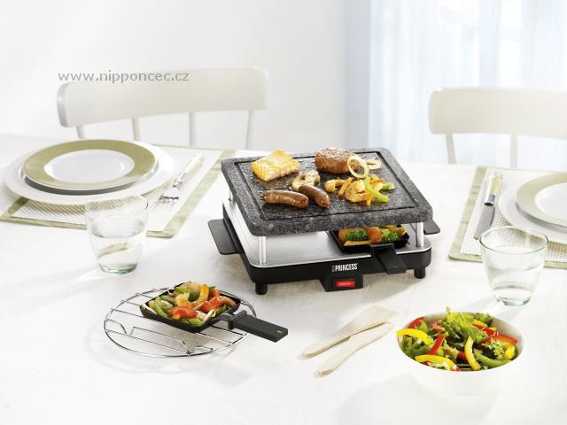 Raclette gril Princess 16 2345  je elektrický gril s pečicím kamenem, set pro 4 osoby.  Na odnímatelné kamenné desce můžete péci ryby, maso nebo zeleninu, brambory a jiné, a současně využívat raclette (pánvičky pro přípravu například sýra apod.). Vzhledem k povrchové úpravě grilovací kamenné desky je možné připravovat potraviny takřka bez tuku, což je ideální pro zdravou přípravu téměř všech druhů potravin - které ale navíc také dobře chutnají.